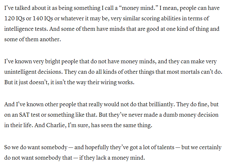 In a 2017 annual shareholder meeting, Warren Buffett was asked how he would look for the next leader of the company. You can watch the full answer here (see topic #33 in the link and the video will sync to the right place immediately), which is fascinating in its own right, but I would like to just point out one relevant excerpt below.