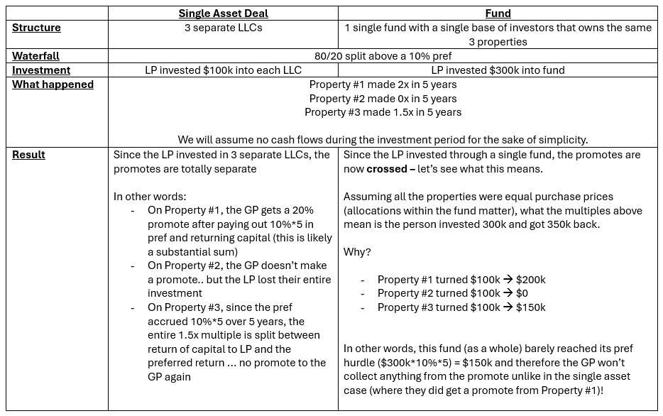 All else equal, an LP is actually better off from a fund structure because the promotes on all of the properties are crossed.