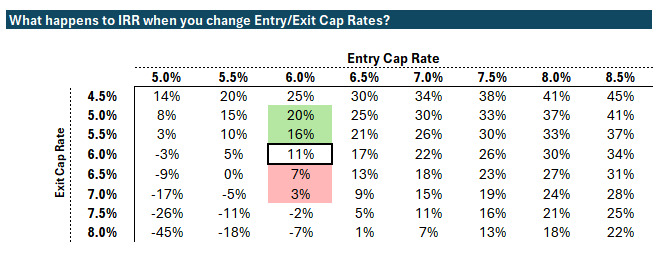 If you start at the 11% square and move up to where the green is, you’ll see that lowering your exit cap rate by 1% (100 bps - from 6% to 5%) moves the IRR you present to investors from 11% to 20%.