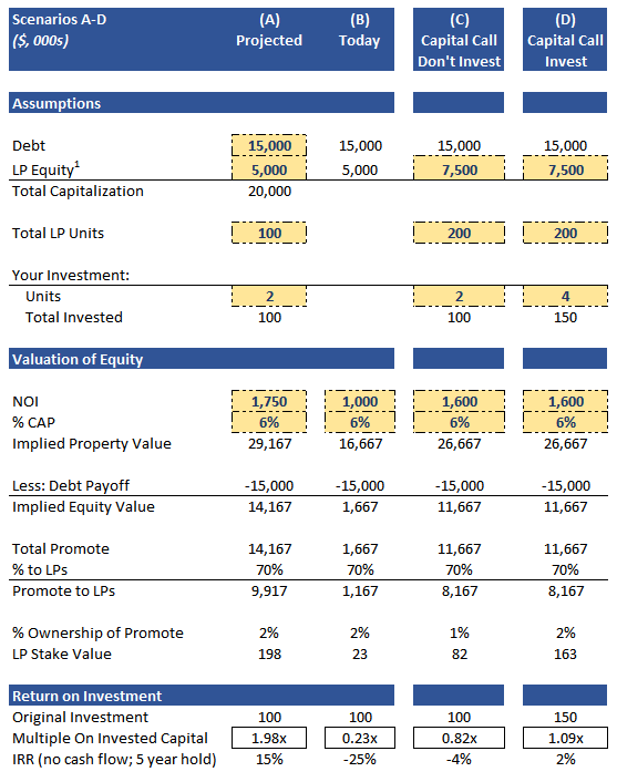 Now, notice that even though losing 4% isn’t great.. it’s a lot better than fire-selling the property in Scenario B. Of course this is dependent on being able to raise NOI back to a decent level, the the cap rates not moving up, as well as the project not needing any more capital beyond this capital call.