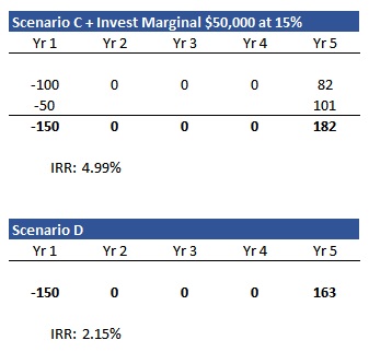 This is important, because if you invested that marginal $50,000 into another deal that earned you 15% over the same 5 year hold period, you’d end up ahead of Scenario D on the overall investment of $150,000.