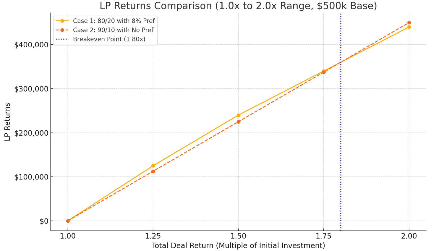If you feel very strongly about the downside risk of the investment, the 90/10 will actually benefit you as an LP above a certain multiple. However, downside risk is hard to predict.. and therefore I would usually guide LPs to invest with a pref for that reason - real estate investments aren’t here to make you 10x returns, so you should be that more careful about protecting your downside (see more on this risk/reward discussion here).