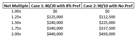 90/10 with no pref: there’s no pref.. so you simply get 90% of 250k which is $225k - you’ll see that plotted below at 1.5x in the orange dotted line