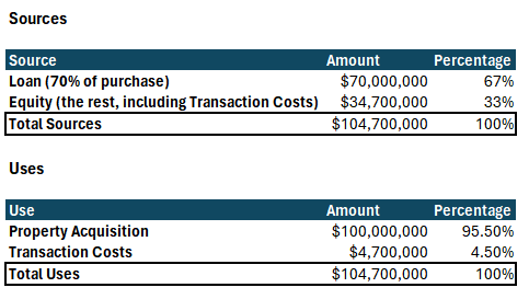 Since these transaction costs are not covered by the loan or original equity of $30mm (which goes to seller), the equity raise needs to increase to account for these costs .. that gets us to a sources and uses table (which you should always look for in a deck, among other things):