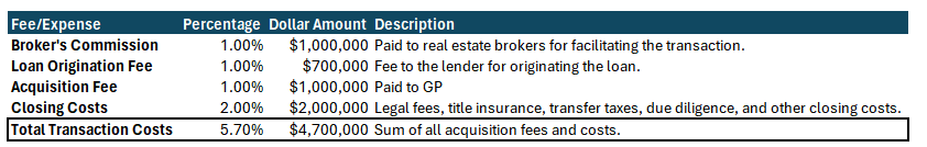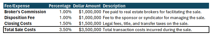Let’s walk through a $100 million multifamily acquisition with 70% leverage, break down the fees, and show how, in a hypothetical sale at the same price, nearly 40% of the initial equity can disappear.