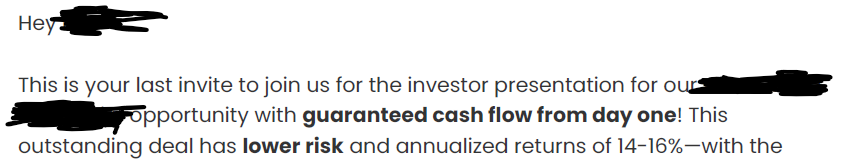 So, in summary, if you see the word "guaranteed" in a pitch, it’s fairly safe that you should run the other way. The same is true about other extreme statements about performance, such as “never lose money” below from a totally different deal.