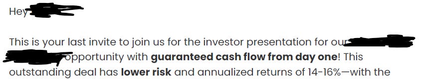 The screenshot below comes from one of the largest syndicators, they’ve raised hundreds of millions in equity to date .. and are actively raising more capital today (this deal being one example).