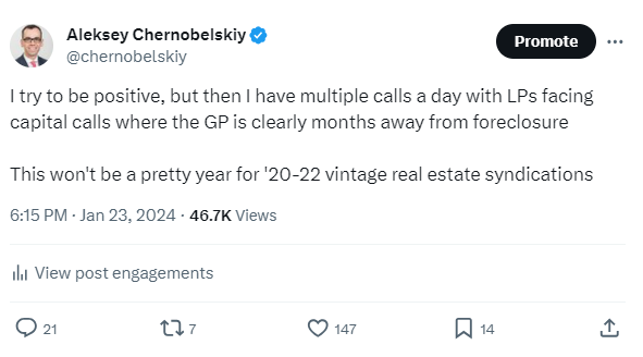 In both cases, there’s (of course) a question of whether you’ll be able to do anything with the realization that a given property is in distress. Even a GP might not be able to do anything with the information, and they’re the ones in control! Having said that, having the information (and ideally having it early) is incredibly powerful for the GP and more powerful than most think even for the LP.
