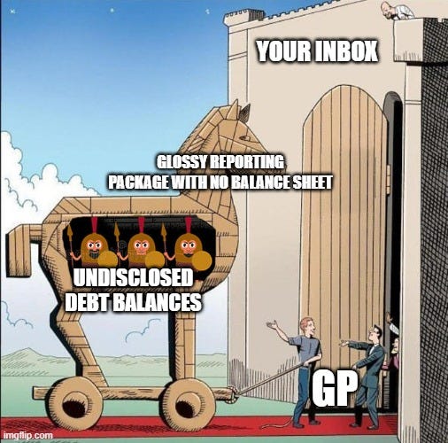 The GP tells you the deal is doing well, and even sends you another one to invest into, but why did the debt principal balance just increase by a few million on the Balance Sheet? On a similar note, why is there a new debt instrument (e.g. loan from the GP or even an external loan / pref equity piece) that’s in the balance sheet when the reporting packages didn’t mention it?