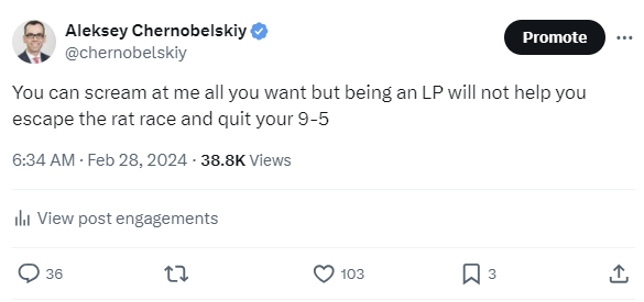 Recall that our goal is to figure out whether “investing as an LP will help me quit my 9-5..”