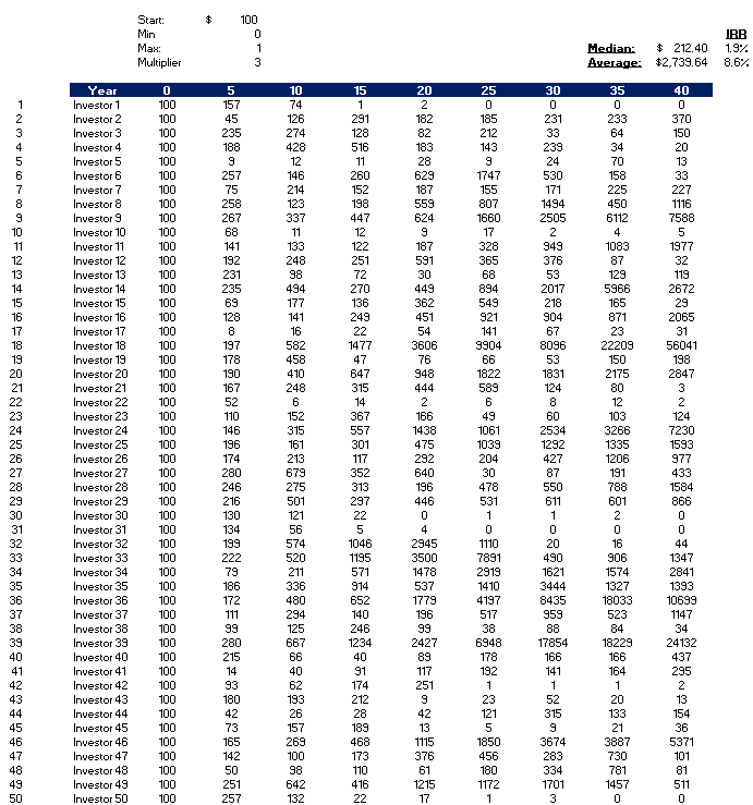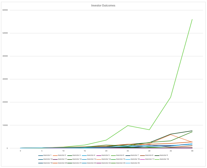 Investor 3 did well on their first deal - a 2.35x multiple in 5 years, and teh second one was alright, but then the third one (a random number generator again) didn’t do so well… the experiment continues on until the investors ends up with 150 (vs original 100) at the end of 40 (!) years
